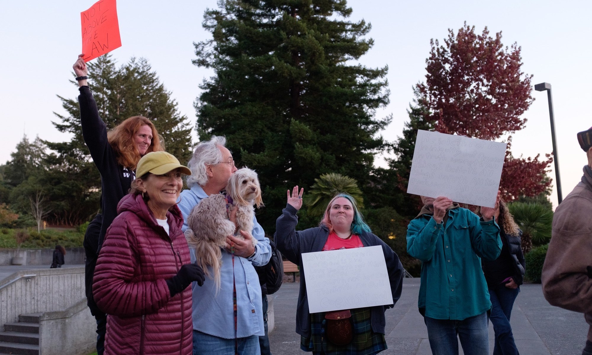 (Photo by Michael Weber) Brennan Duck and Kyla Hock brought an American flag and a poster to the Common Cause protest on Nov. 8 at Humboldt State University’s quad. Brennen Duck took an oath to defend this country from all enemies foreign and domestic. “And right now our president is acting as a domestic enemy,” …